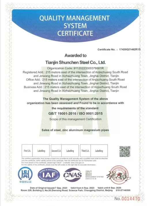 Standartlar: GB/T 3091-2015 "Aşağı təzyiqli mayelərin daşınması üçün qaynaqlanmış polad borular", GB/T 13912-2020 "isti daldırma sinklənmiş polad borular". Məhsul üçüncü tərəf sınaqlarından keçib və sınaq hesabatına malikdir.